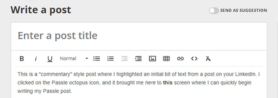 This is a "commentary" style post. It was created by Passle when I highlighted an initial bit of text from a post on your LinkedIn. I clicked on the Passle octopus icon and it brought me here to this screen where I can quickly begin writing my Passle post.