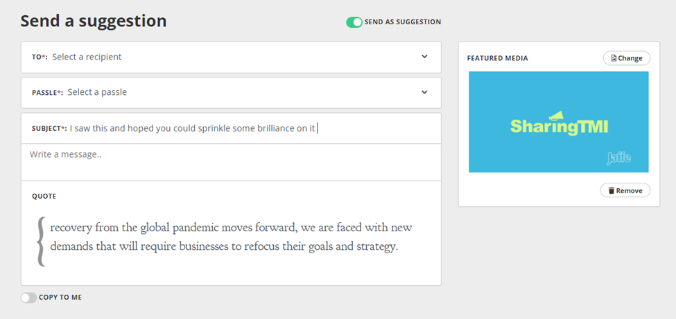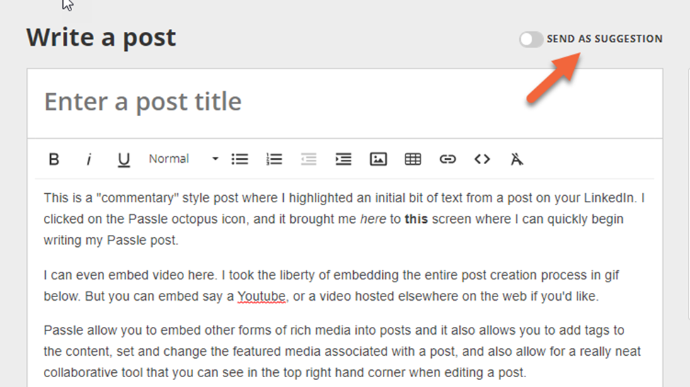 The suggestion tool is a really neat and collaborative feature that can help users suggest content to other stakeholders. This tool appears in the top right hand corner when editing a post.