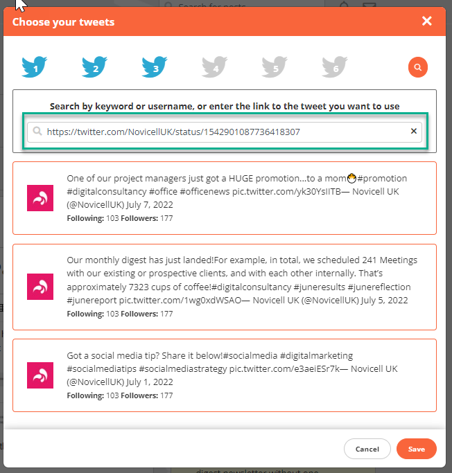 The twitter picker will try and suggest content but if you want something specific, simply copy and paste the URL to the tweet you would like to see along side your blog post.